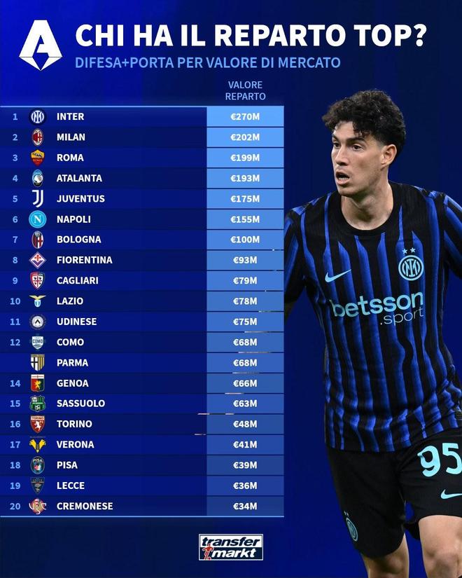 德转列意甲20队防线身价排名: